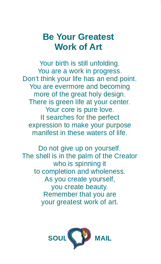 Like the example below, I am inspired to transform the image into visual art. Then as I intently view the art, words of wisdom and truth are spontaneously perceived and writtten down. I am sharing SOUL MAIL to inspire and uplift people to get through the darkest of times, as well as, appreciate the best times of life.