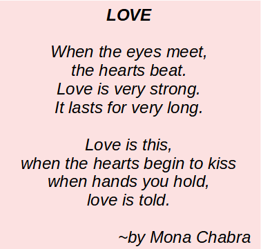 I met and worked with many amazing, inspiring artists who dealt with and rose above their health issues. One of the most memorable was Mona Chabra, a beautiful, talented 10 year old girl with a wonderful sense of humor. Mona was one of my first patients in my first job at a children’s rehabilitation hospital near Pittsburgh, Pennsylvania. She was experiencing a disease that kept her from walking, talking clearly, and using her hands to write. When I left my position there, she touched my heart and gifted me with this incredible poem she had created.